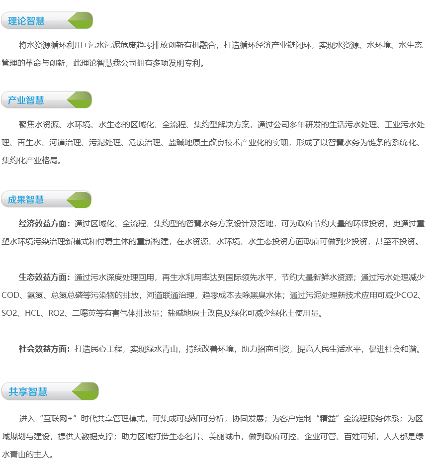 针对地方区域污水处理,分散不成系统、运维费用高昂、污泥二次污染、各环难成合力等诸多难题,2013年,瑞恒茂首创“智慧生态水务”方案,形成了区域化、全流程、集约型、可复制的水循环经济系统,同时联合“两院士一规划”成立智慧生态产业联盟,大力推进“智慧生态水务”的产业化进程,智慧生态水务产业于 2020 年建设完毕。