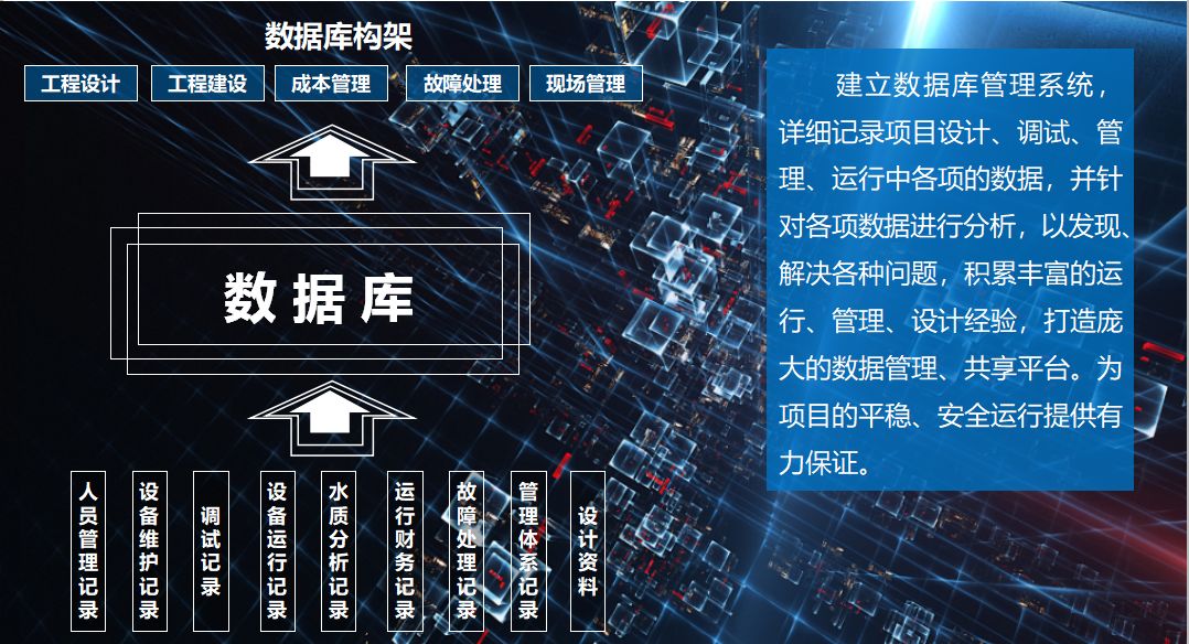 水厂建立数据库管理系统,详细记录项目设计、调试、管理、运行中各项的数据,并针对各项数据进行分析,以发现、解决各种问题,积累丰富的运行、管理、设计经验,打造庞大的数据管理、共享平台,为项目的“安、稳、长、满、优”运行,提供大数据支持与保证。